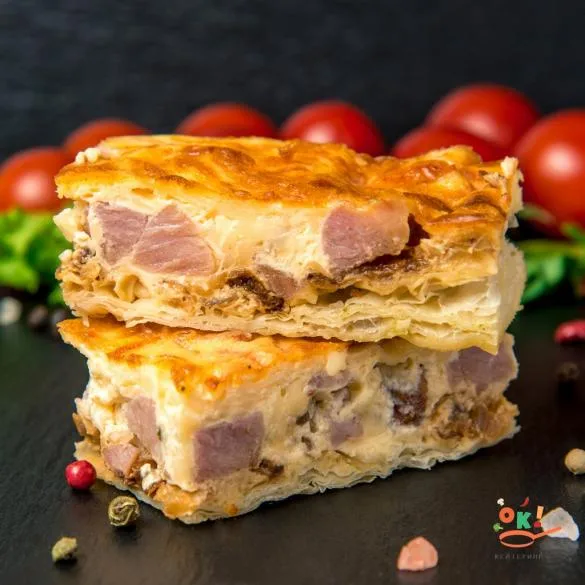 Відкритий пиріг з шинкою і цибулею конфі кількість