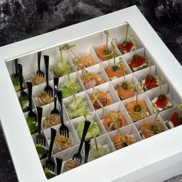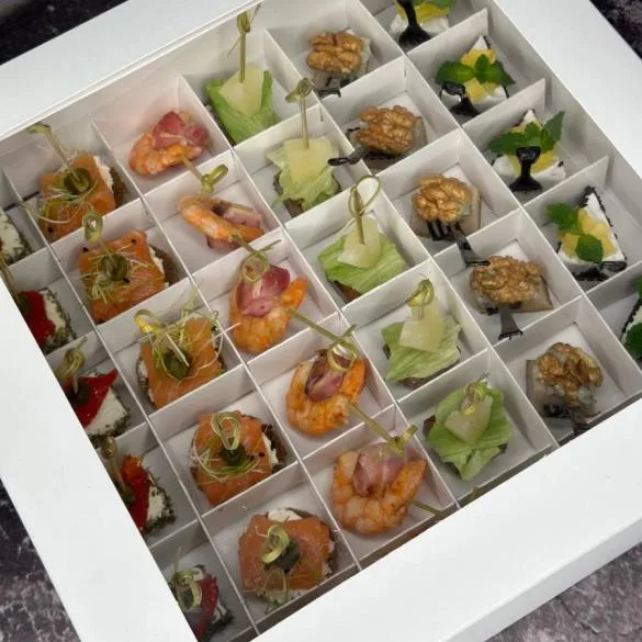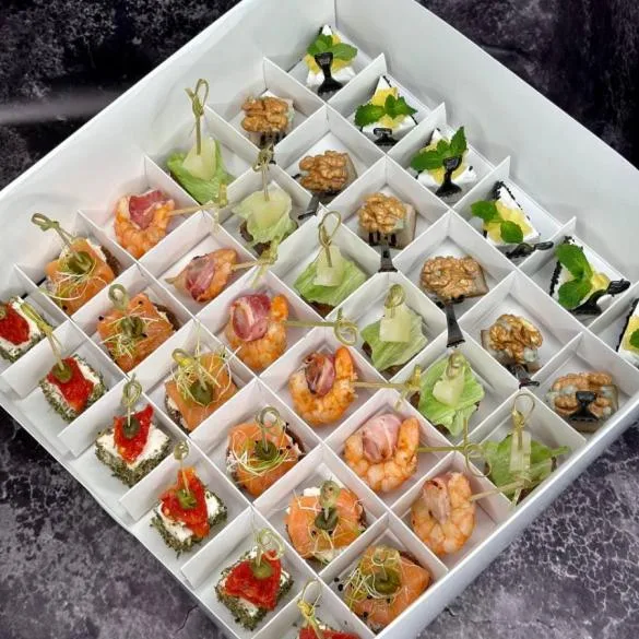 Вишуканий бокс для жіночої компанії, в якому Ви знайдете для себе канапе на будь-який смак: від м’ясних і морських до суто вегетаріанських. Бокс холодних закусок розрахований на компанію 2-4 людини. Ідеально підійде для замовлення в офіс на День народження або будь-яке інше свято. Даний бокс канапе можна замовити на доставку в Києві додому або в офіс. Гості будуть у захваті як від зовнішнього вигляду так і від смакових якостей наших закусок.