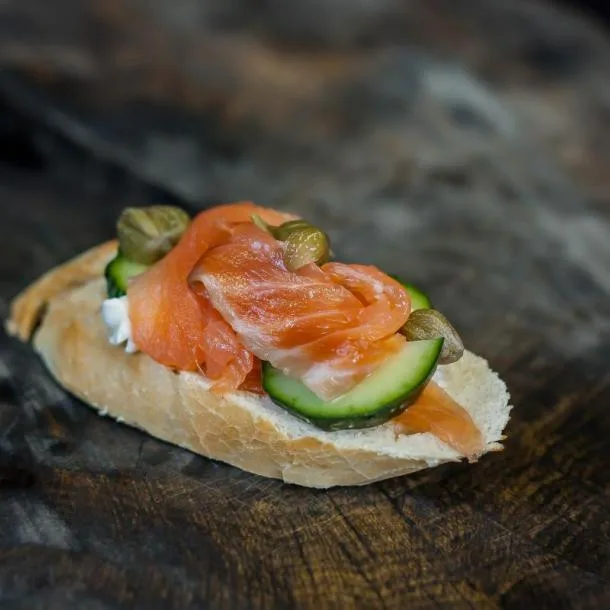 Брускетта з лососем Гравлакс, свіжим огірком і сиром Філадельфія кількість