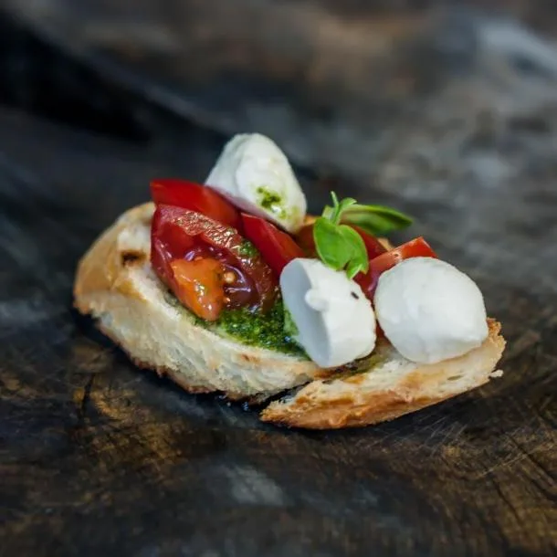 Брускетта з моцарелою, помідором Черрі і соусом Песто