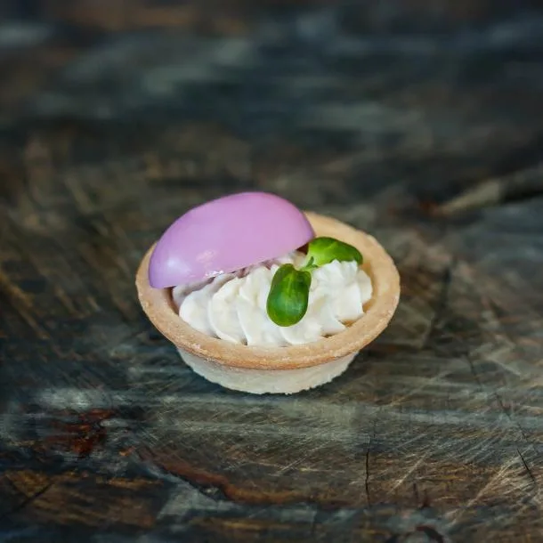 Буше з курки з перепелиним яйцем в буряковому маринаді в тарталетці