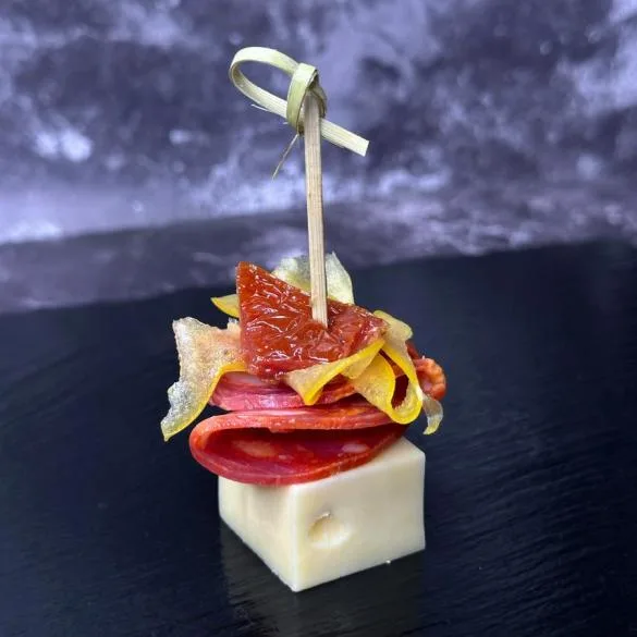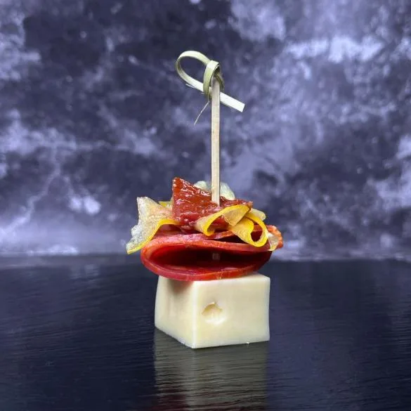 Канапе з салямі Чорізо, сиром Емменталлер, жовтим перцем і в’яленим томатом – це яскраве поєднання смаків і ароматів в одному невеликому, але насиченому закусочному шедеврі.