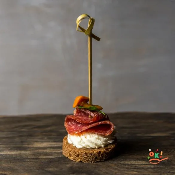 Італійське салямі на подушці з сирного мусу на житньому хлібі з маринованим грибочком