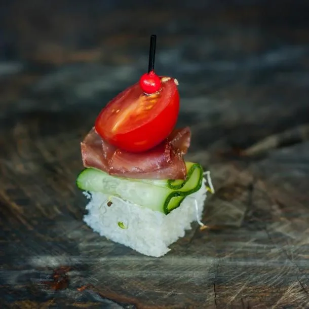 Канапе з бастурми, огірка, половинки Черрі на багеті