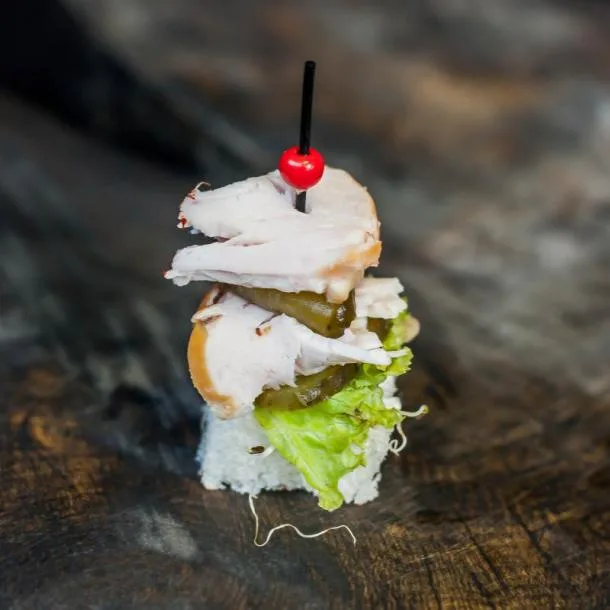 Канапе з курячою грудкою, маринованою огірком, яблуком і багетом