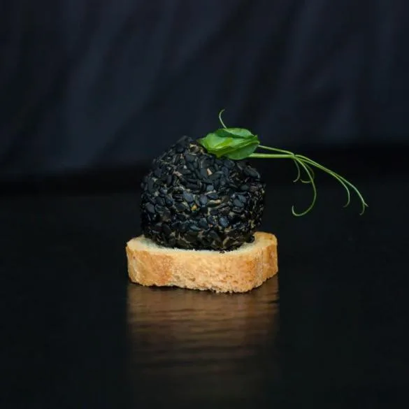 Паштет з печінки курчати в чорному кунжуті на тості Мельба