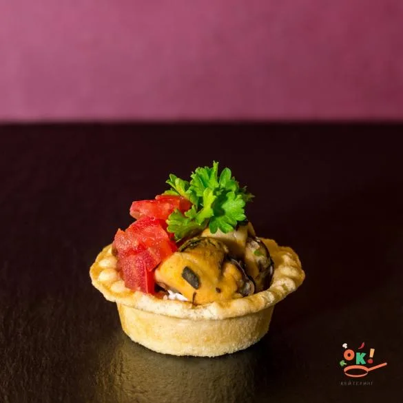 Мідії, мариновані в кисло-солодкому соусі, з томатами і зеленню в тарталетці