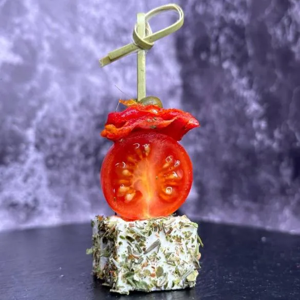 КАНАПКА З СИРОМ, ПОМІДОРОМ ЧЕРІ ТА В'ЯЛЕНИМ ТОМАТОМ