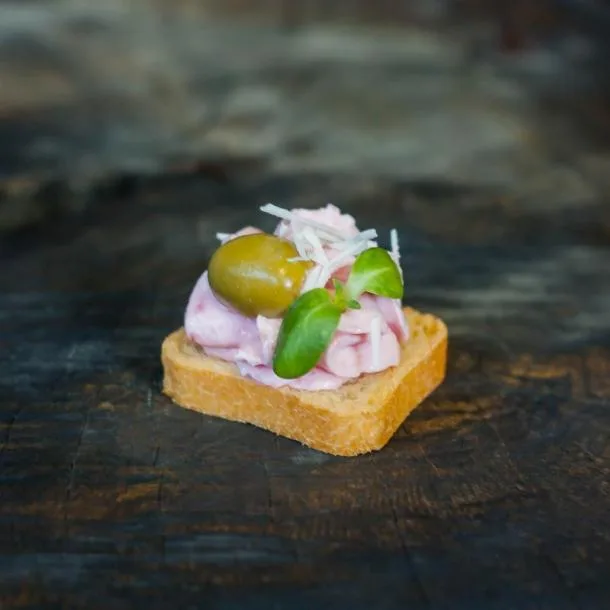 Канапе з рожевим хумусом і оливкою на тостику Мельба